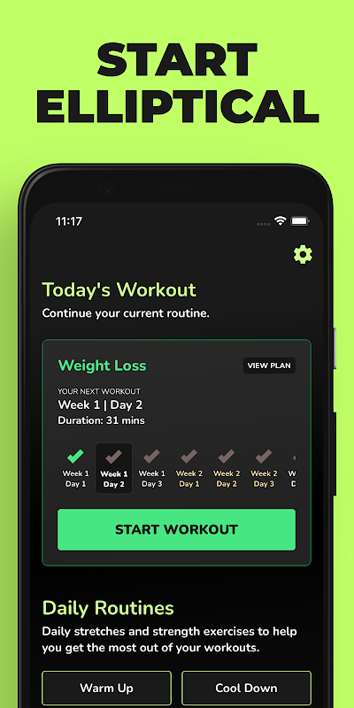 Elliptical'i Başlat, antrenmanınız boyunca size rehberlik edecek adım adım talimatlar verecektir. Ne kadar zor ve ne kadar süreyle antrenman yapacağınızı bileceksiniz, böylece minimum yaralanma riskiyle istikrarlı bir şekilde gelişebilirsiniz. Her plan, yavaş yavaş daha zorlayıcı olacak şekilde tasarlanmıştır, böylece vücudunuz siz tükenmeden uyum sağlayabilir ve büyüyebilir.