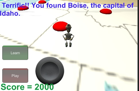 Use a joystick to move Goober around two maps of the United States. Goober can walk around a map that shows the locations and names of the states and capitals. On the other map showing only the outline of the states, have Goober walk to a state and its capital that the program tells you to find. Then you must touch the state capital with your finger.