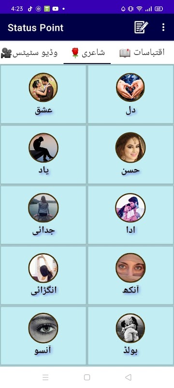 The interface of this app is very user friendly. In each status, there are options to share the specific status on social networks just on one click. Another unique feature of the app is that whenever the user refreshes the status category or reopens the app, the app will provide new status every time.