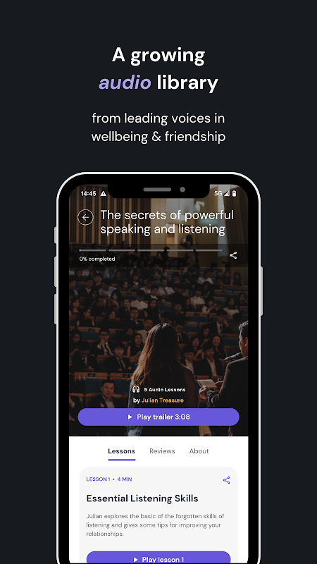 Uygulamamız aynı zamanda sağlık, hobi ve arkadaşlıkla ilgili çeşitli konuları kapsayan, özenle seçilmiş sesli yolculuklardan oluşan büyüyen bir kütüphaneye ücretsiz erişim sağlar. TED konuşma efsanesi Julian Treasure ve BBC'den Sheridan Voysey de dahil olmak üzere ses öğretmenlerimiz bu alanlardaki önde gelen seslerdir. Geniş seçenek yelpazesi, kişisel ses yolculuğunuzu ihtiyaçlarınıza uyacak şekilde özelleştirmenize olanak tanır.
