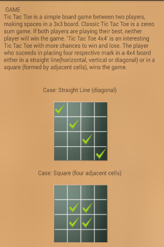 Tic Tac Toe oyun deposunda mevcut üst ücretsiz oyunlardan biridir. Ve tic tac toe oyunları bazıları da en çok kazanan oyunlar listelenmiştir. Ama bu tic tac toe oyunları en çok büyümüş kullanıcılar için özellikle sıkıcı. Burada "üst üste dört", tic tac toe çok oyunculu uygulaması geliyor. Bu tic tac toe uygulama tic tac toe çok oyunculu oyunlar sıkıcı bir alternatiftir. Arka arkaya dört bir 4x4 kurulu boşluk yaparak, iki oyuncu arasında bir tic tac toe oyunudur. '3x3 Tic Tac Toe' bir zere toplam oyunudur. Her iki oyuncu da en iyi oynuyorsanız, ne oyuncu oyunu kazanır. "Dört üst üste 'kazanmak ve kaybetmek şansı daha ilginç bir Tic Tac Toe uygulamasıdır. 4x4 kurulu dört ayrı işareti yerleştirerek suceeds oyuncu ya düz bir çizgide (yatay, dikey veya çapraz) ya da bir meydanda (komşu hücreler tarafından oluşturulan), oyunu kazanır. Toplam 19 olgu oyunu kazanmak için. Bu çok oyunculu destekler.