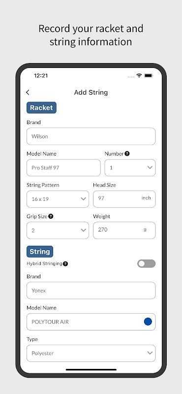 • Tenis raketi ve kordaj bilgisi ekleyin