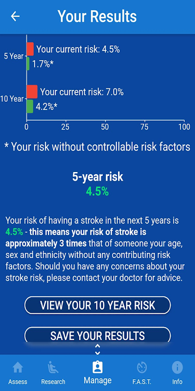 The award-winning, fully validated, free to use Stroke Riskometer app is a unique and easy to use tool for assessing your individual stroke-related risk. It calculates your risk through evaluating a series of risk factors such as age, gender, ethnicity, lifestyle and other health factors that directly influence your likelihood of a stroke. It has been designed as a new tool to help individuals and health professionals reduce the risk and incidence of stroke.