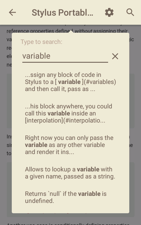 The Stylus Portable Reference offers quick keyword search with autocompletion and adjustable fonts for text and code samples.