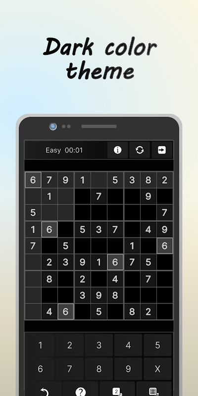 Ücretsiz sudokunun en önemli özelliği 8 farklı renk temasıdır. Mavi ve yeşil olmak üzere 2 açık ve düz renk teması ve gece oynayabileceğiniz 1 koyu renk teması vardır. Ayrıca, arka plan görüntüleri ve çekici renkler içeren renk temaları vardır: Su, Bulutlar, Kış, Çöl ve Yaz. Daha fazla renk teması gelecek!