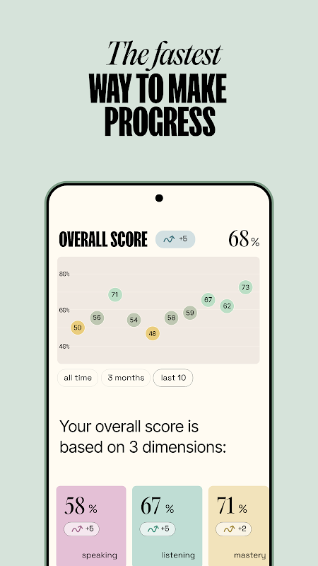 * İlerlemenizi takip edin ve zaman içinde dinleme, konuşma ve anlama becerilerinizdeki Akıcılık Puanınızı takip edin.