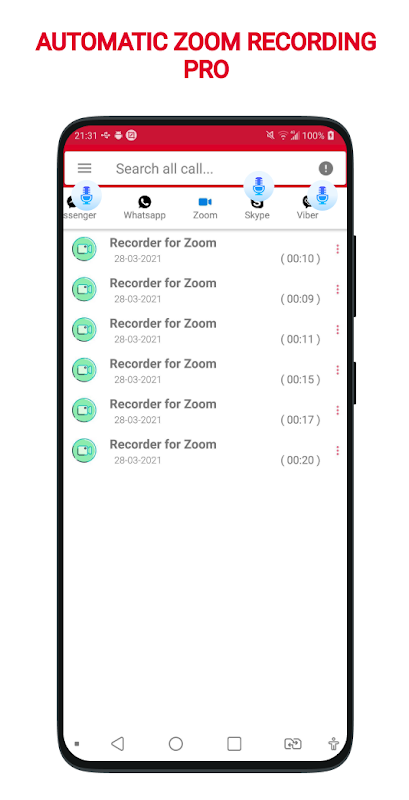 Phone call Recorder is able to detect Messenger,Whatsapp, Skype, Zoom, Instagram, Viber calls automatically and start recording.