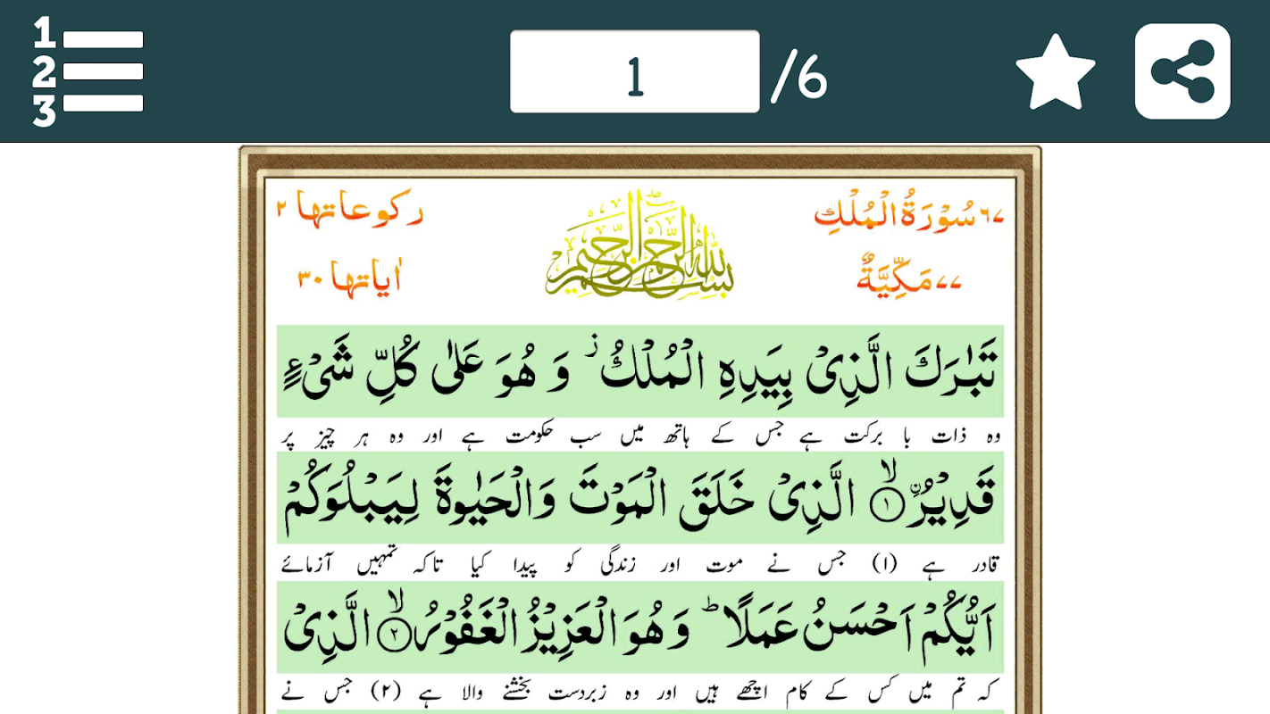Suresi Mülk Urduca Tercüme ile birlikte Arapça yazı ile yazılmıştır.