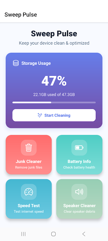 Sweep Pulse, seçili dosyaları temizlemenize, pil durumunu kontrol etmenize ve hızı test etmenize yardımcı olur.
