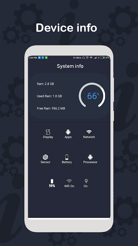 Bu cihaz bilgisi - telefon bilgisi android akıllı telefonunuzun bileşenlerini algılar ve cihaz durumu, sensör bilgisi, işlemci bilgisi, işlemci, sistem bilgisi, cpu aracı, uygulama bilgisi - uygulama bilgileri, servis bilgisi, model, yazılım, durum, donanım detayları, işlemci, bellek, pil, donanım, sensörler, ip adresi, hız, mac adresi, ekran çözünürlüğü, aygıt, akıllı telefon, bellek kullanımı, adres, yapı, özellikleri, ana bilgisayar, düzey, liste, bellek, ağ, os, güç , çözünürlük, seri, destek, zaman, usb, kullanıcı, wifi. Ekran Ekran boyutu bu Cihaz Bilgisi: Cihaz Bilgilerini Görüntüle uygulamasında görünecektir. Sistem bilgileri ve Cihaz bilgileri, yüklü tüm uygulamaları listede tüm uygulama bilgileriyle birlikte gösterir.
