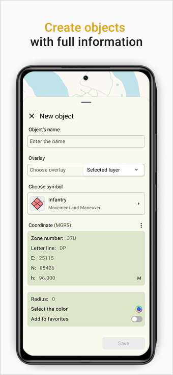 * Taktik Nesnelerin Oluşturulması: Uygulamamız NATO APP6 standartlarına göre katmanlar ve taktik nesneler oluşturmanıza olanak tanır. Haritadaki kritik noktaları ve nesneleri kaydedebilir ve yönetebilirsiniz.
