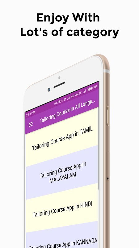 This application included Tailoring Course App in TAMIL ,Tailoring Course App in MALAYALAM,Tailoring Course App in HINDI ,Tailoring Course App in KANNADA,Tailoring Course App in TELUGU,Tailoring Course App in MARATHI,Tailoring Course App in URDU ,One Piece Cutting Stitching Videos,Evening Gown Cutting Stitching Video, TULIP Salwar Cutting and Stitching Videos