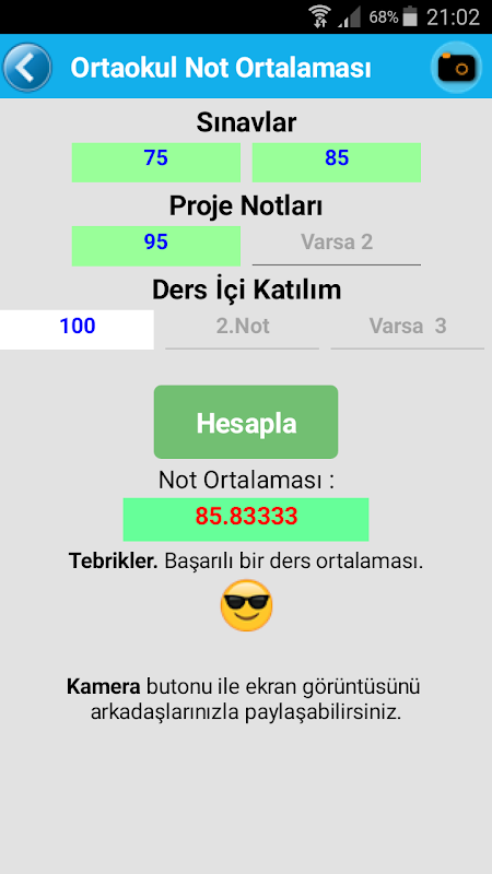 *Kayıt olmadığı şikayetleri neticesinde artık programda ilk sınavınız dan itibaren notlarınızı kayıt edebilirsiniz. 1 sınavda girseniz E-Okul tarzı hesaplamasını yapar.