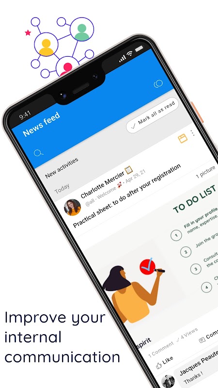 Talkspirit, tüm çalışanlarını, hatta e-posta adresi olmayanları (ön hat çalışanları) bağlamayı sağlayan bir Kurumsal sosyal ağdır (şirketler için güvenli iç sosyal ağ).