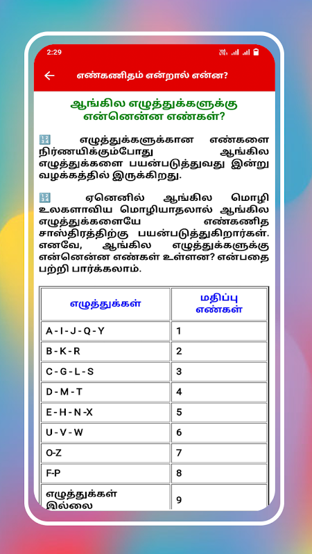 • İngilizce Harfler için Numeroloji Numaraları: Tamil dilindeki Numeroloji hesap makinesi Uygulaması ile İngilizce harfleri, etkilerinin daha geniş bir şekilde anlaşılması için numerolojik sayılara dönüştürün.