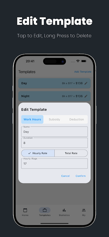 Günlük vardiyalarınızı kaydetmek ve aylık saatlerinizi ve kazançlarınızı otomatik olarak hesaplamak için basit ve kullanımı kolay bir çalışma saati izleyicisi.