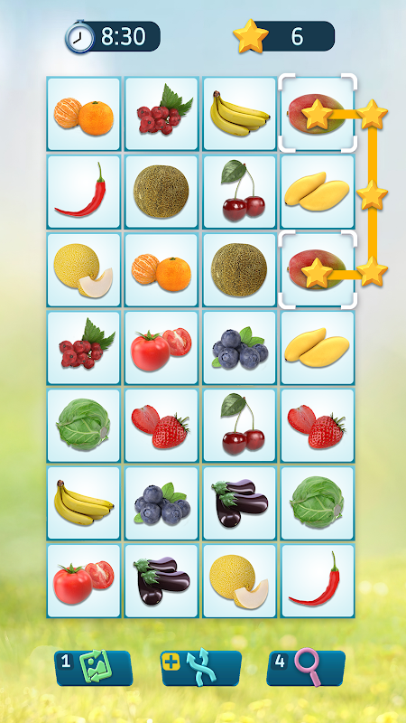 Tap to select a tile. Then find a similar tile to connect them together. Try to imagine a future path between these tiles. The pair matching puzzle allows to draw three lines maximum connected at a 90° angle. Can you onnect tiles like that? If yes, go and tap for the second time. Remember, the longer the path – more bonuses you'll get in this pair matching puzzle game. Use your brain and logic!