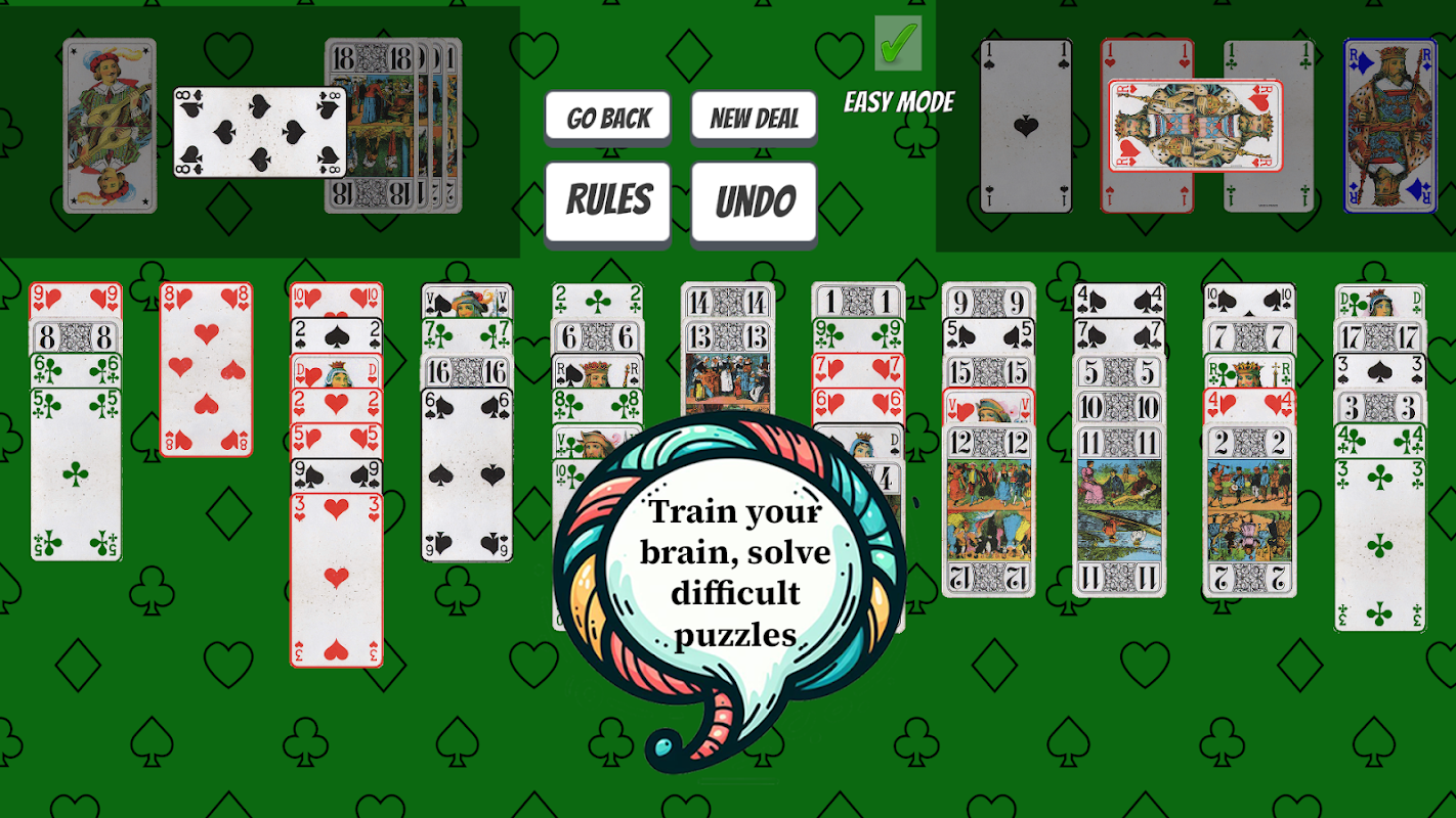 Klondike çeşidi: Sıkışmış hissetmeniz durumunda gizli kartları karıştırmanıza olanak tanıyan karıştırma mekanizması, zorluğu azaltmak için 1 sütun daha