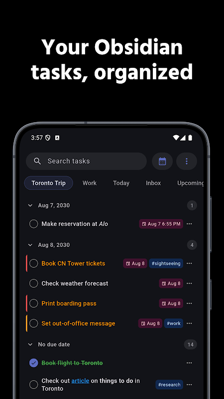 Herhangi bir uygulama açmadan Obsidian görevlerini görün. Widget'lardan görevleri işaretleyin. Bugün, Vadesi Geçmiş, #etiketler veya kaydedilmiş herhangi bir filtre için widget'lar.