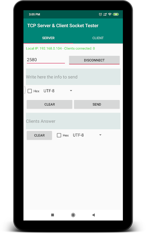 Application's main purpose is to  test TCP sockets with another mobile devices or Desktop applications .