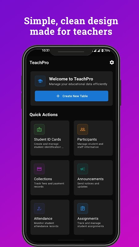 TeachPro, öğretmenlerin günlük görevlerini daha kolay ve daha düzenli hale getirmek için tasarlanmış hepsi bir arada bir uygulamadır. Öğrenci katılımını yönetiyor, kimlik kartları oluşturuyor, zaman çizelgeleri ayarlıyor veya duyurular gönderiyor olun — TeachPro tüm bunları telefonunuzdan yapmanıza yardımcı olur.