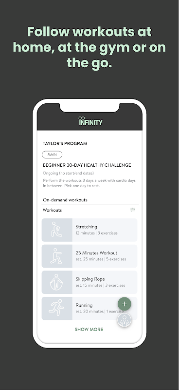 Her adımda motive olmak için egzersizlerinizi takip edin, yemeklerinizi planlayın ve ilerlemenizi izleyin. Ayrıca, hepimizin bir araya geldiği ve hedeflerinize ulaşma ve dengeli, sağlıklı bir yaşam tarzı sürdürme yolunda birbirimizi cesaretlendirdiğimiz Team Infinity Topluluğuna bağlanın.