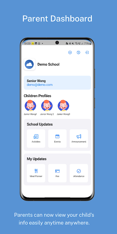 Tenjin Ebeveyn Uygulaması, ebeveynlerin çocuklarının okul aktivitelerini, etkinliklerini, duyurularını, devamlarını ve okul ücretlerini görüntülemelerine olanak tanır.