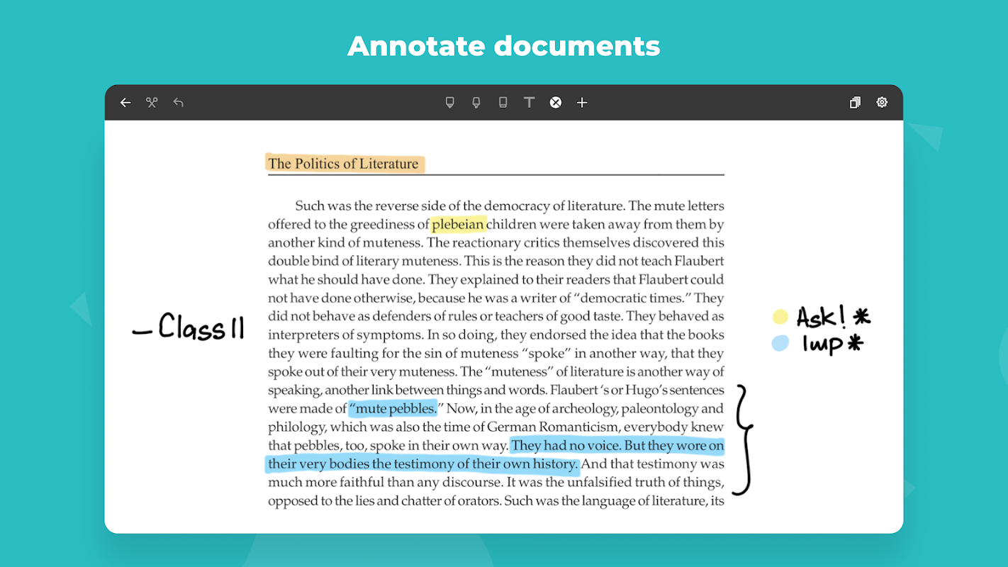 Create new notebooks by importing PDFs, MS Office documents or images; or add them to your existing notebooks. Highlight and underline information or write notes on your documents/images. Make your notes personal!