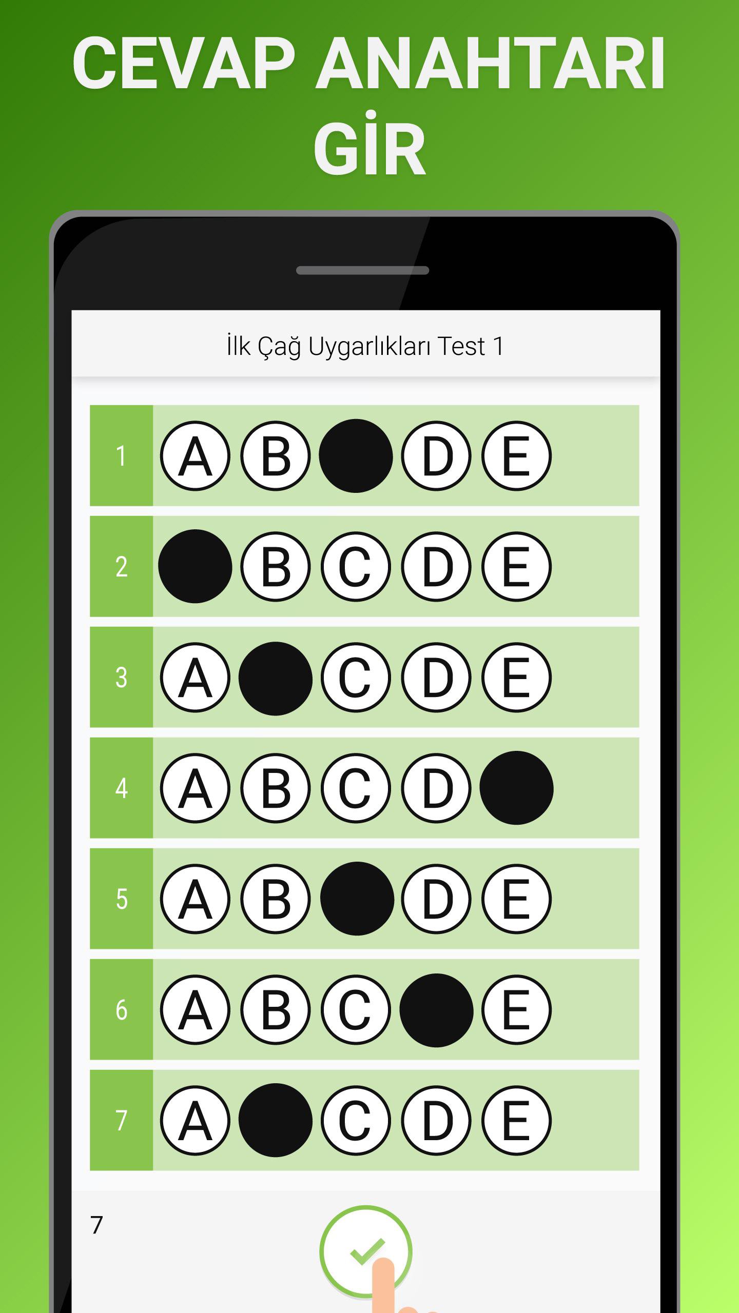 Cevaplarını telefona işaretle, cevap anahtarını gir, sonucu görüntüle ve kaydet.