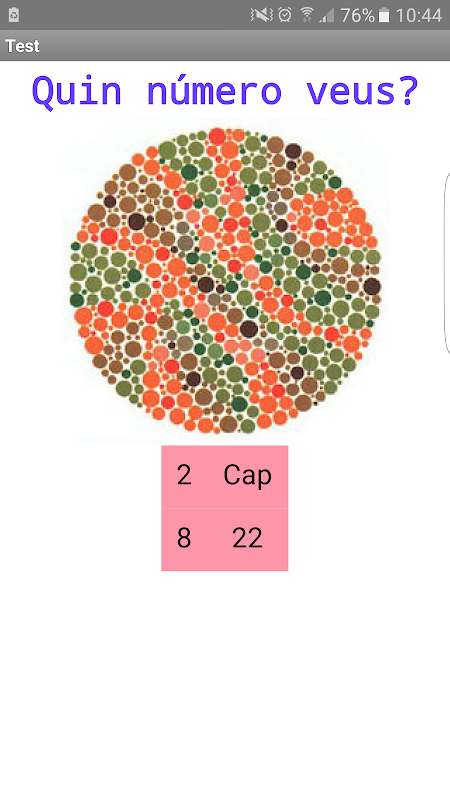 Consisteix en un test de daltonisme, en el qual es mostra una sèrie de cartes d'Ishara, que són les plantilles per fer el test. A partir d'aquí, es va fent el test fins arribar al final que es mostra el resultat indican-te quin percentatge de daltonisme tens o si no en tens.