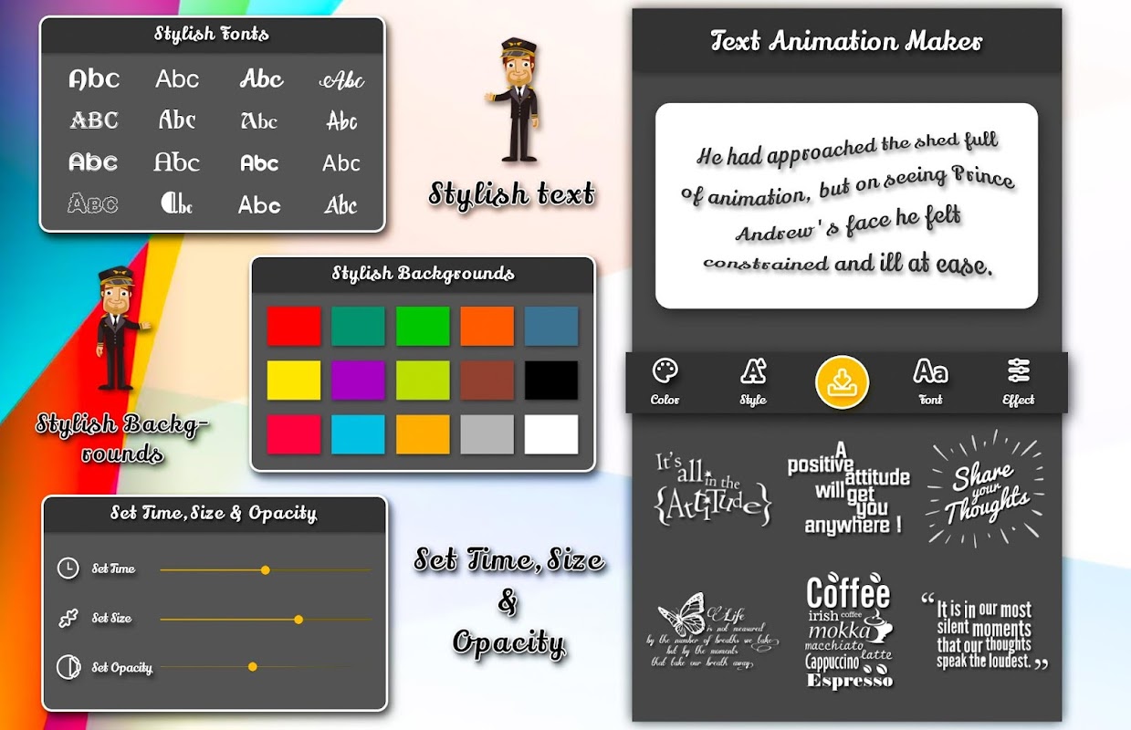 Background Text animation app where you can overlay colorful background with text animation. You can change the background color with color wheel easily. You can also change the text color with colorful wheel easily