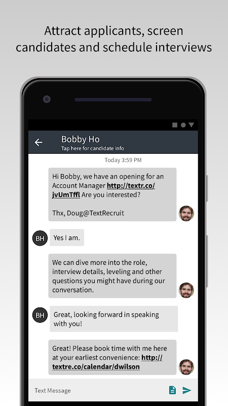 TextRecruit senin çalışanın yaşam döngüsünü optimize etmek metin, sohbet ve yapay zeka ile iletişimi güçlendirir aday ve çalışan nişan platformudur. özelleştirilmiş ve entegre çözümleri ile, TextRecruit tüketici mesajlaşma uygulamaları birleştirir ve merkezi bir iletişim platformu haline getirir.