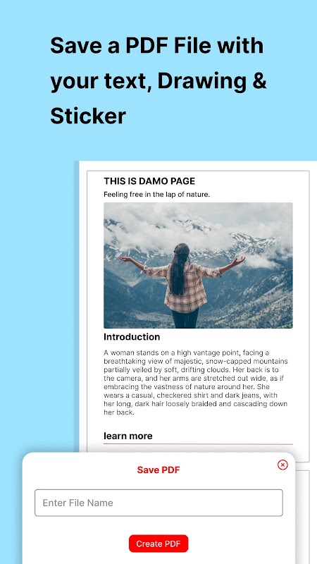 Başlamak için "PDF Oluştur"a dokunmanız yeterlidir. Burada metin biçimlendirme, başlıklar, yazı tipleri, boyutlar ve arka plan renkleri gibi çeşitli özelleştirme seçenekleriyle not taslakları oluşturabilirsiniz. Daha kişiselleştirilmiş bir görünüm için, yardımcı program belgeye çizimler, çıkartmalar ve fotoğraflar eklemenize olanak tanır. İçerik tamamlandıktan sonra, kullanıcı PDF dosyasına bir ad verebilir ve hızlı erişim için ana ekrandan kolayca bulabilir.