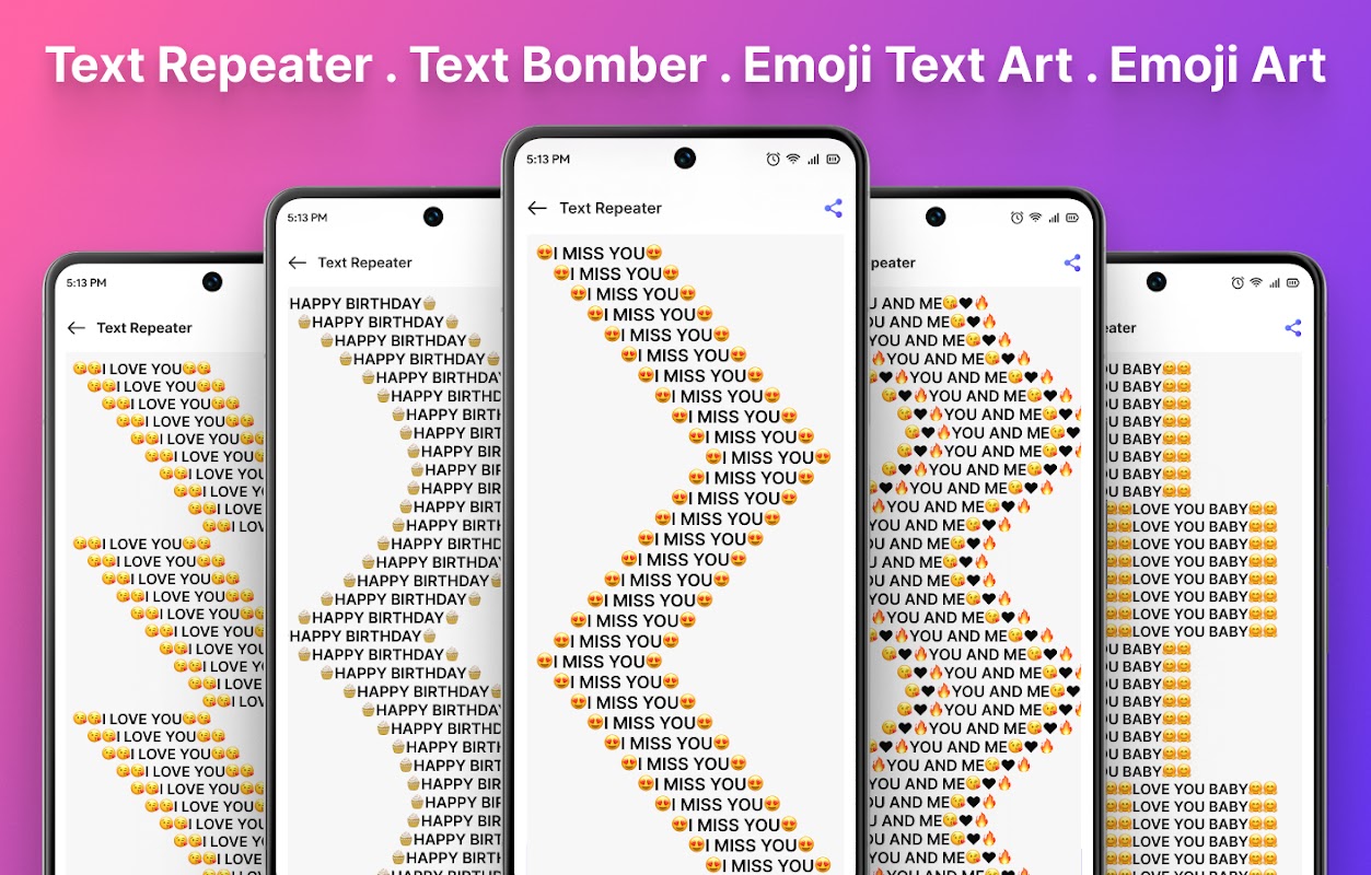 Metin genişletici, metinleri, mesajları, cümleleri veya cümleleri tekrarlamanıza olanak tanıyan eğlenceli ve yaratıcı bir uygulamadır. Metin çarpanı ile esprili ve göz alıcı bir metin efekti oluşturun. Text bomber ile arkadaşlarınızı ve ailenizi hayran bırakacak tekrarlayan metinleri kolayca oluşturabilirsiniz. Arkadaşlarınıza şaka yapmak istiyorsanız, metin tekrarlayıcı bu iş için mükemmel bir araçtır.