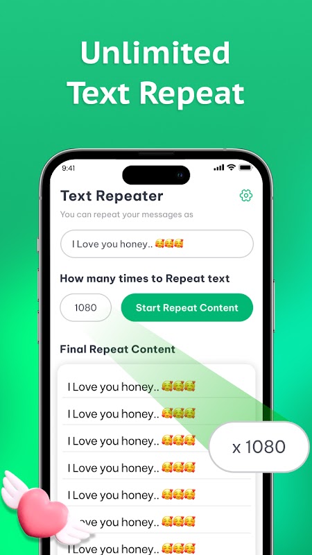 Text Repeater'ı kullanmak için uygulamayı uygulama mağazasından indirin, tekrarlamak istediğiniz metni girin ve anında oluşturmaya başlayın. Tekrar sayısını ihtiyaçlarınıza ve ruh halinize göre yönetin ve mesajlarınızı messenger'dan sosyal medyaya kadar her yerde zahmetsizce paylaşın.