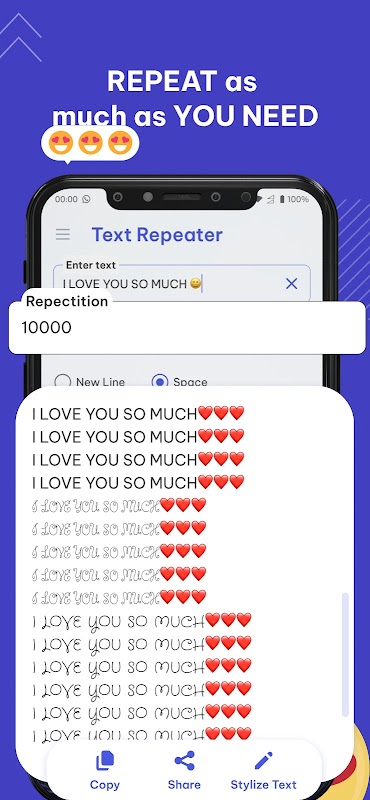 ""Text Repeater"" uygulamasıyla tanışın - birkaç basit dokunuşla metni kolayca tekrarlamak ve kopyalamak için en iyi araç. Metni manuel olarak kopyalayıp yapıştırmanın tekrarlayan ve zaman alıcı görevine elveda deyin!