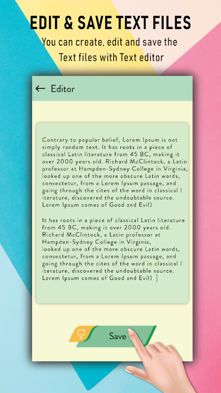 You can edit and save the files with text editor. Text editor & text viewer app can be used as standard text editor for plains text files, it is suitable for both general and professional use. Text editor & text viewer app lets you quick edit text files and gives you save option as well. It has been optimized for mobile phones. The speed and stability of the Text editor & text viewer app is far better than others. Text editor & text viewer app is full featured text viewer and text editor.