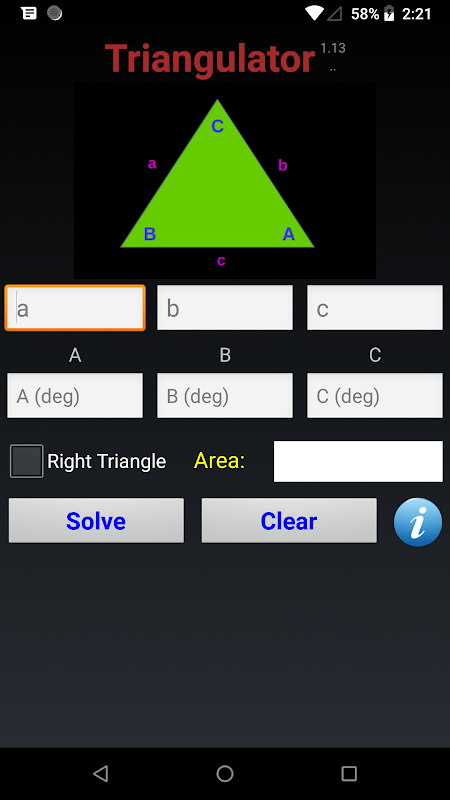 Minimum veri girin, uygulama geri kalan tarafları, açıları, alanı hesaplar.