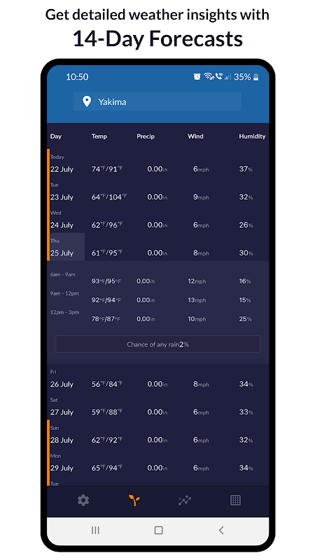 • Geçmiş 7 gün, Sonraki 14 gün, Sonraki 28 gün ve Sonraki 180 gün için hava durumu tahminlerini kullanarak kısa vadeden uzun vadeye kadar planlar oluşturun.