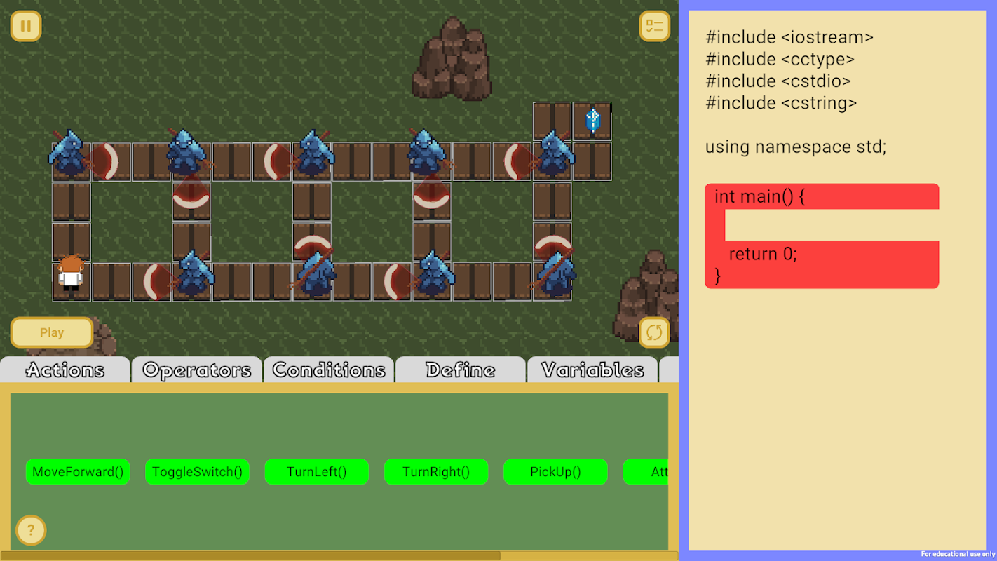 - Gelişmiş: C++ yapısına aşina olan oyuncuların, karakteri yönlendirmek ve seviyeleri temizlemek için C++ sözdizimini kendilerinin kod düzenleyiciye yazması gereken en zorlu mod. Sürükle ve bırak özelliği ve önceden tanımlanmış kodlama blokları kaldırılmıştır.