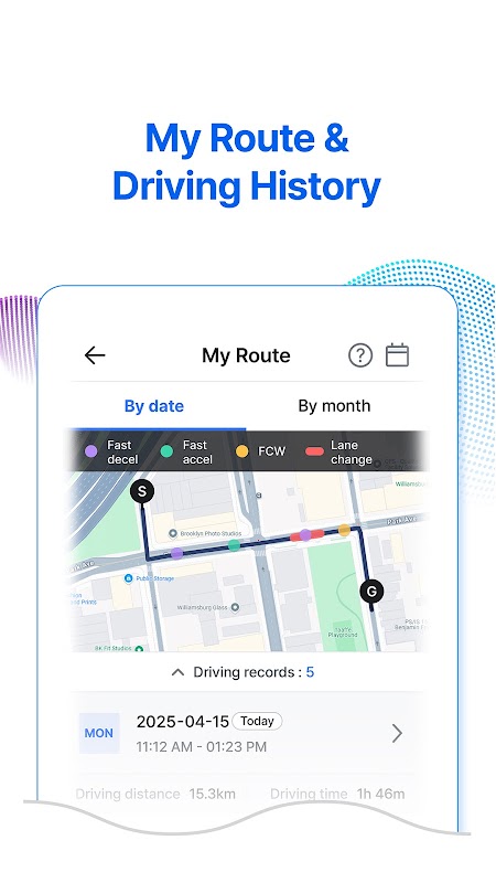 Tarih, saat, mesafe, rota ve sürüş davranışı gibi veriler dahil olmak üzere sürüş geçmişinizi görüntüleyin.