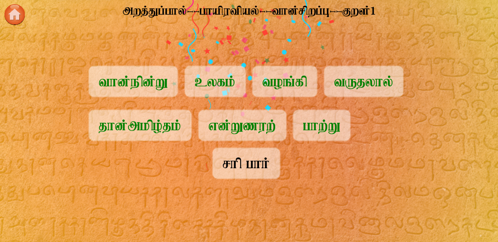 Rastgele yedi kelimeden Thirukkural'ı bulun. Kelimeleri doğru konumlarına sürükleyip bırakın ve yerleşimlerini doğrulamak için onay düğmesini kullanın. Kelime yeşil renkte görüntüleniyorsa konumu doğrudur. Kelime kırmızı renkte görüntüleniyorsa, konumu yanlıştır.