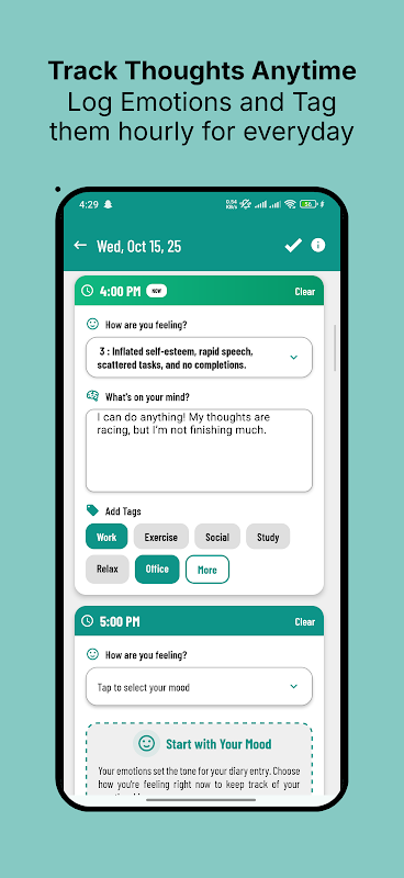 - Sezgisel grafikleri (günlük, haftalık ve aylık görünümleri) kullanarak zaman içindeki düşüncelerinizi ve duygularınızı görüntüleyin.