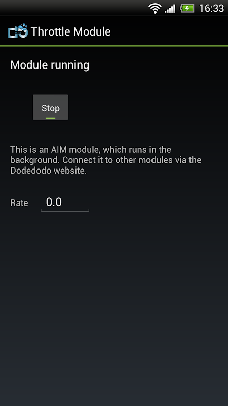 This is an android AIM Module (to be used in the Dodedodo framework, see www.dodedodo.com) which provides a throttle for string messages. The incoming message stream is throttled such that messages on the outgoing stream are sent with the defined rate. To achieve that, the messages in between are dropped. The module can be used in combination with other AIM modules and is designed to throttle a video stream when sending it across devices.