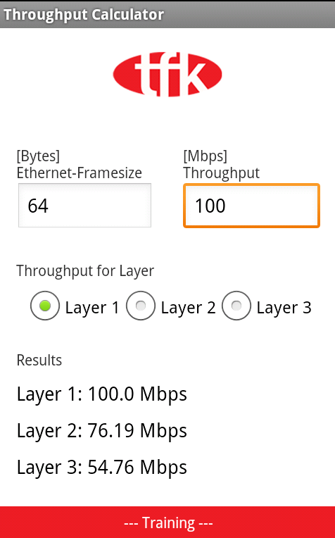 An important paramenter for the Ethernet throughput is the framesize in Ethernet-Layer 2. This app calculates the Ethernet throughput (UDP only). It converts and explains network speed across layer 1, 2 and 3 of the OSI-model.Define framesize for layer 2 and a throughput.Then select the layer for which the throughput belongs to. Now you get the regarded throughput for the other layers.