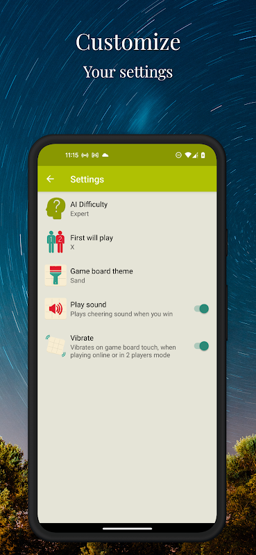 * 4 zorluk seviyesiyle (kolay, orta, zor ve uzman) AI - Her hareketle zihninizi keskinleştirin! Hem Tic Tac Toe hem de Gomoku, sizi meşgul ve zorlayıcı tutmak için çeşitli zorluk seviyeleri sunar. Her yaştan oyuncu için mükemmel!