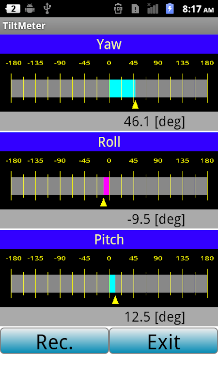 Bu uygulama smartphone X, Y, Z ekseni eğimini gösteren bir metredir.
