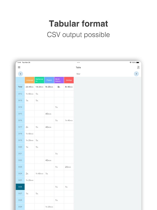 Tablo ekranında Excel'e benzer şekilde her gün için kaydedilen zamanı görüntüleyebilirsiniz. Ayrıca CSV dosyası olarak dışa aktarabilirsiniz.