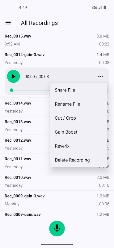 Tiny Audio Recorder, ses kaydetmek, kayıtları paylaşmak, dalga formu görünümüyle ses bölümlerini kesmek veya kırpmak ve gain ve reverb gibi efektler uygulamak için kullanılabilen çok küçük bir ses kayıt uygulamasıdır. Ayrıca, mevcut kaydı silip yeniden başlatan Hızlı Sıfırlama gibi kullanışlı özellikler de içerir. Bu özellik, benim gibi bir müzisyenseniz ve bazı notaları karıştırdıktan sonra hızlıca yeni bir kayıt yapmak istiyorsanız kullanışlıdır. Ayrıca arka planda kayıt yapma ve kaydı duraklatma seçeneğiniz de vardır.