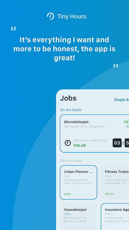 Tiny Hours tam size göre bir zaman takipçisi. Evraklarınızın yerine geçen Tiny Hours'u daha acısız ve güçlü bulacaksınız. Tiny Hours'u her açtığınızda, neye ihtiyacınız olduğunu biliyor, Clock In? ya da Mola Vermek? veya Break Dur? veya Saat Çıkışı? Düğme, dokunmanız için tam orada.
